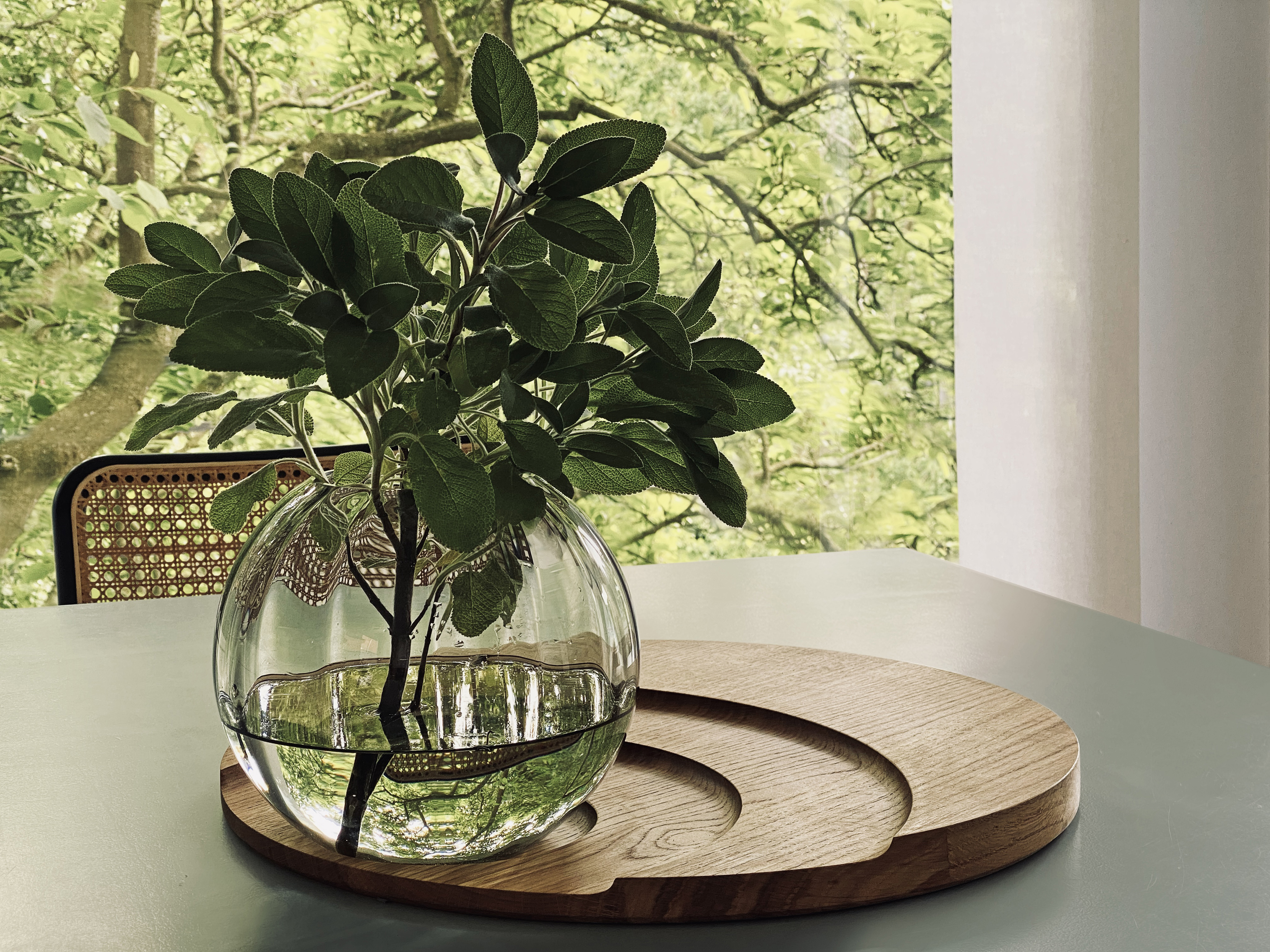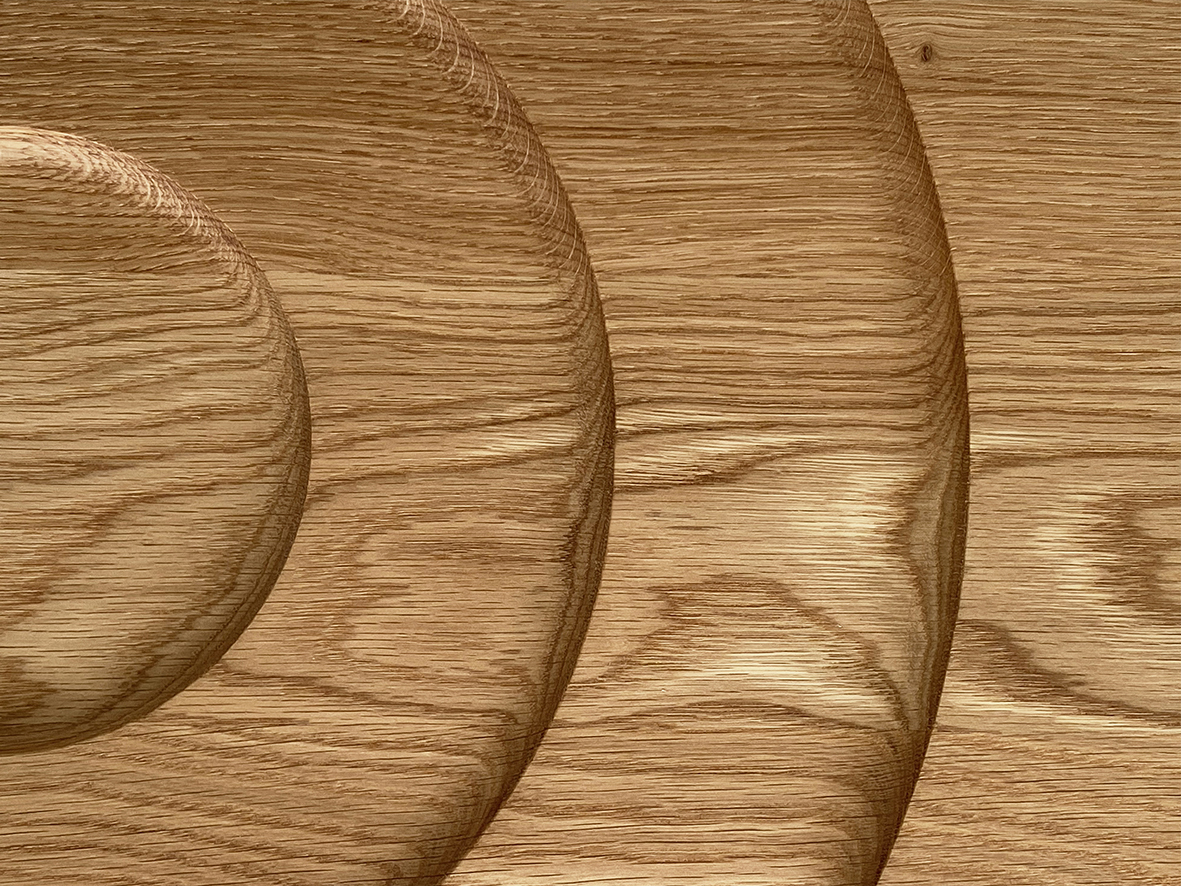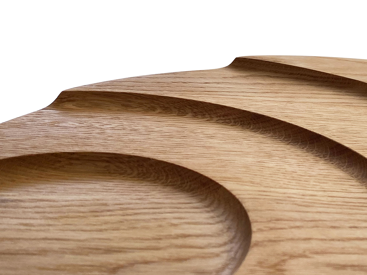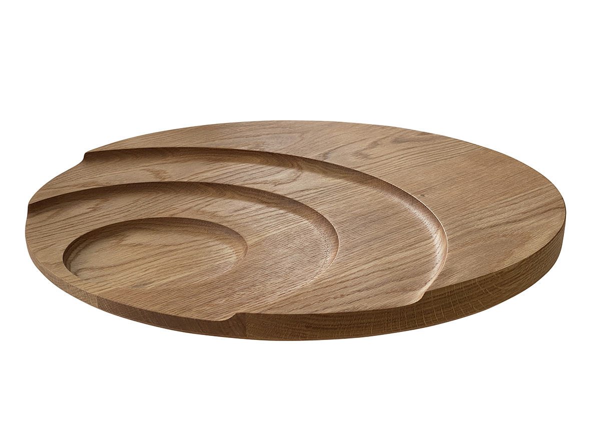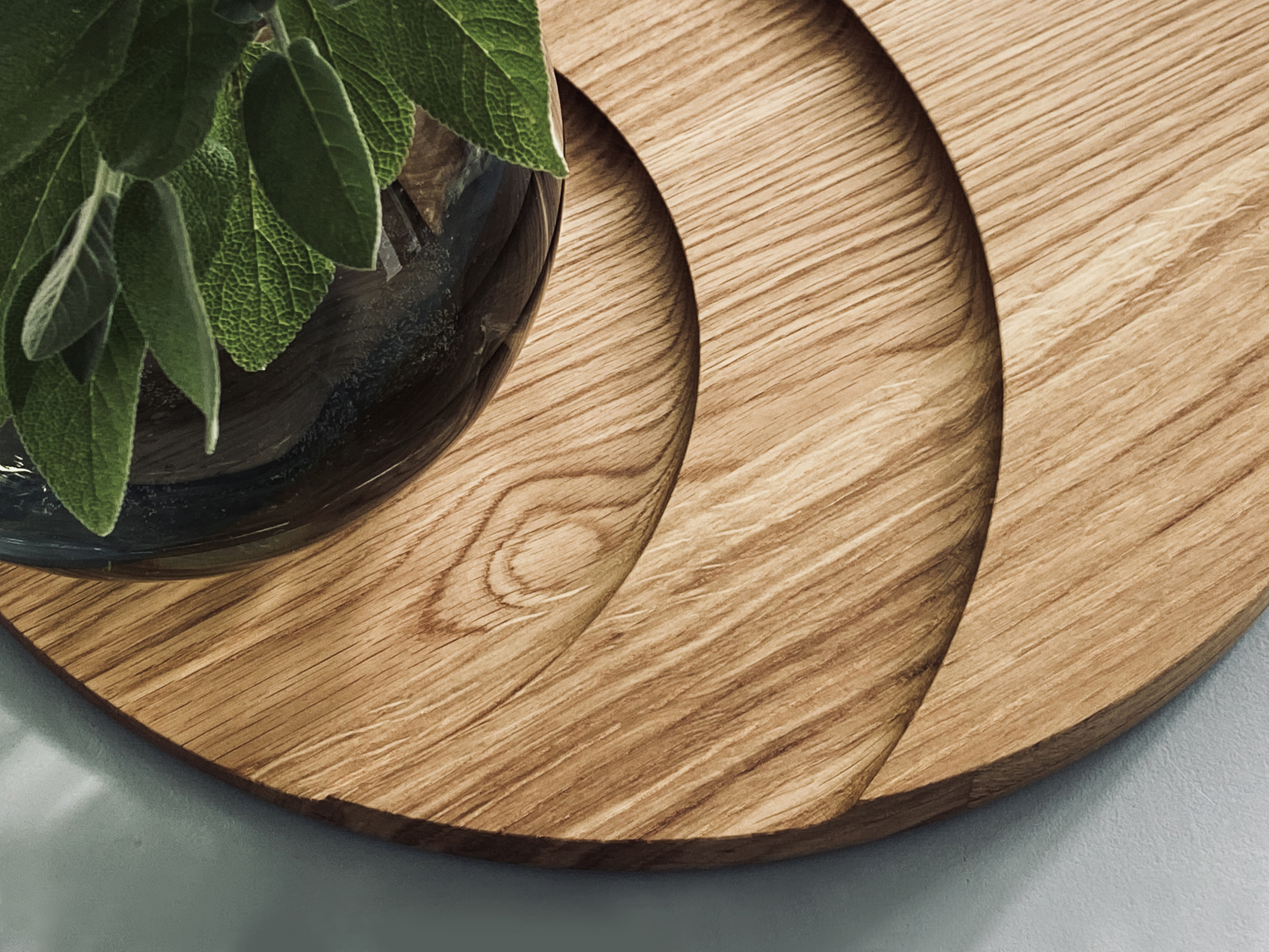 Centerpiece, Tablett, Étagère: AJE, bestehend aus einem Tablett mit weich gerundeter Innenkante und 3 ebenen Holztellern unterschiedlicher Größe, lädt ein zum variablen Dekorieren und Anrichten. Gestapelt entsteht eine Etagere - asymmetrisch oder klassisch zentriert - nebeneinander arrangiert bilden die Holzflächen innerhalb des Tabletts kleine Inseln, die auf vielerlei Art bespielt werden können. AJE wird aus massivem Eichenholz gefertigt und fein geschliffen. Das Holz wird mit einem besonderen umweltfreundlichen Leinöl behandelt, welches die Anforderungen der Spielzeugnorm EN 71-3 erfüllt und lebensmittelecht ist. Produkte der Marke bannigfein. werden ausschließlich in Schleswig-Holstein von sorgsam ausgesuchten Betrieben gefertigt. Das verarbeitete Holz stammt aus nachhaltiger und vorzugsweise heimischer Forstwirtschaft. bannigfein+ Nutzen Sie die Möglichkeit, AJE bezüglich der Holzart, Oberflächenbehandlung (40 verschiedene Farbtöne) oder auch in den Abmessungen nach Ihren individuellen Wünschen anpassen zu lassen. Gerne unterbreiten wir Ihnen ein Angebot und freuen uns auf Ihre Anfrage unter service@bannigfein.com! DIMENSIONEN: Ø 450mm, Höhe 30mm (Schale); Ø 250/170/100, Höhe 20mm (Teller) MATERIAL: Eiche massivOBERFFLÄCHE: ökologisches Leinöl, naturGEWICHT: 2,0 Kg LIEFERUMFANG: 1x Holztablett + 3x Holzteller DESIGN: Anneke Bieger